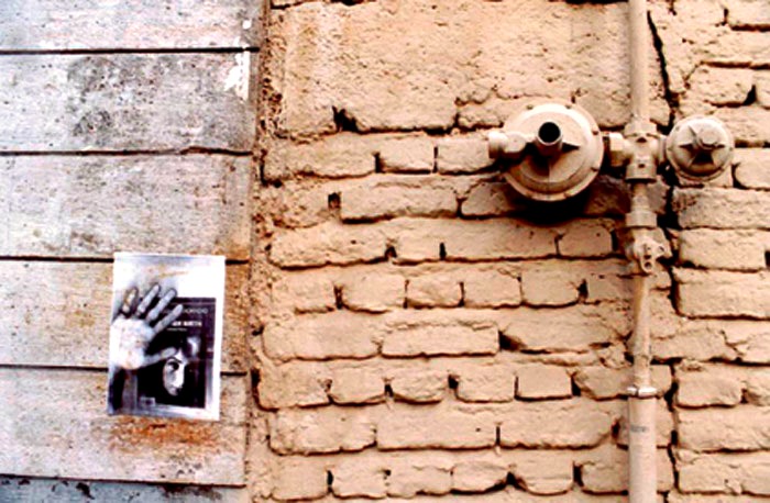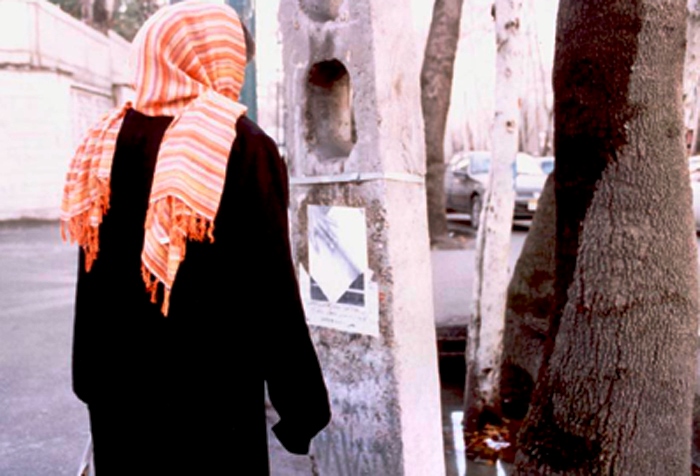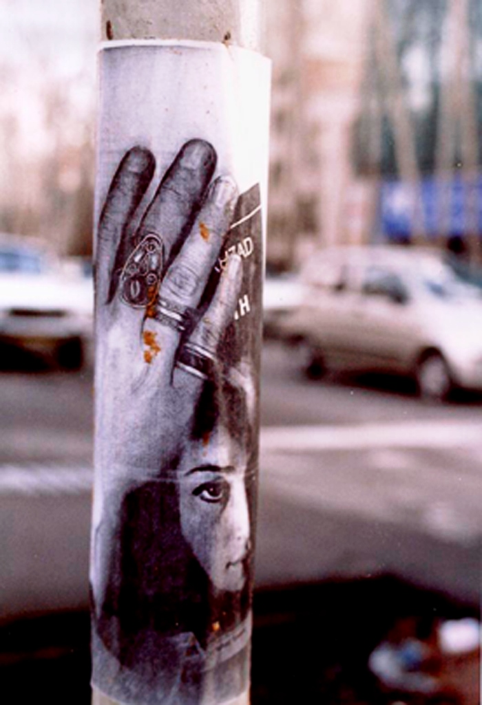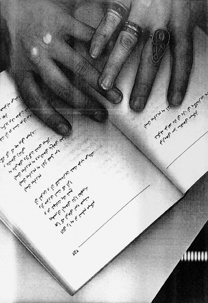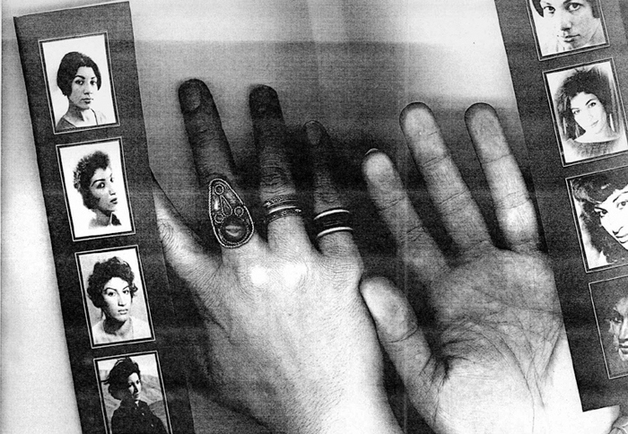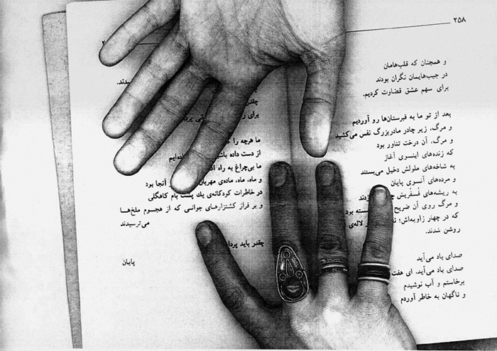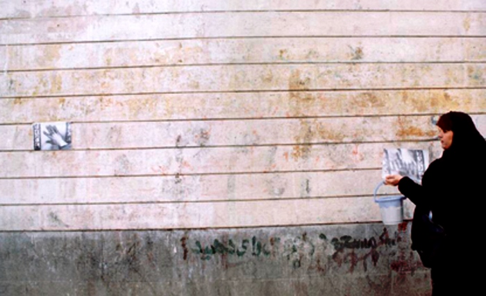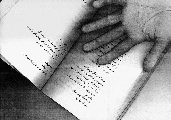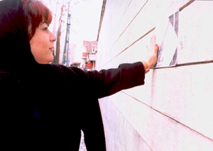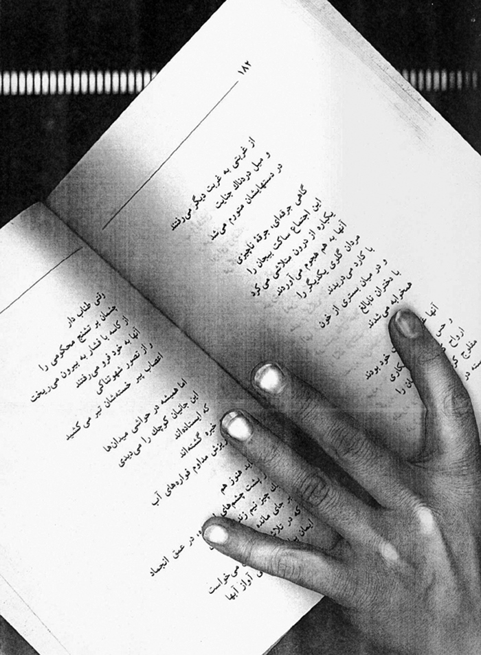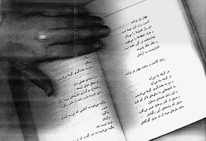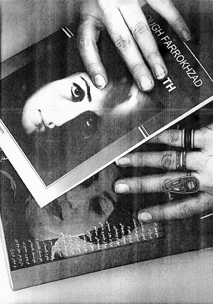 Two years ago (2004) on her birthday, I prepared a street performance for I believed observing her birthday was more important than wailing her absence. From a bookstore in Bagh-Ferdows in northern Tehran, I set off for Zahir od-Dowleh Cemetery, the poet’s final resting place, with an arm full of posters, a bucket of glue and a brush, like city workers. I had photocopied pages of Forugh’s books and her photographs. I had printed my hand, complete with finger-rings, over these images, as if to leave my own mark on her poetry — Forugh.