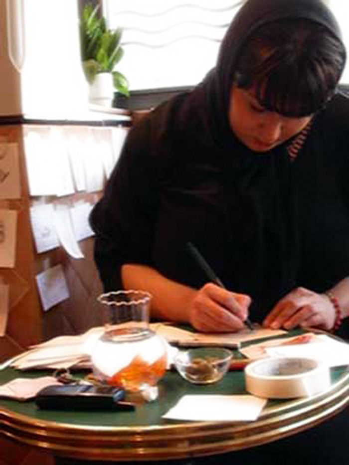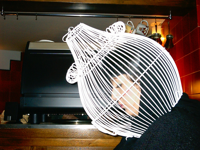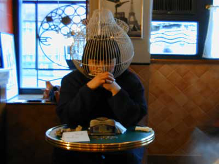 I have a cage on my head, with a smile on my lips in complete silence. Twelve hours. A small tape recorder in front of me which plays the chirping of a small canary. I am selling slips of papers — Hafez divinations. In Tehran, walking to a place, or waiting at the red light, you will see a man or a boy carrying a cage. In the cage is a bird who, upon order, picks a slip on which appears a poem of the great lyrical poet is printed. People pay and the bird picks the augur.
