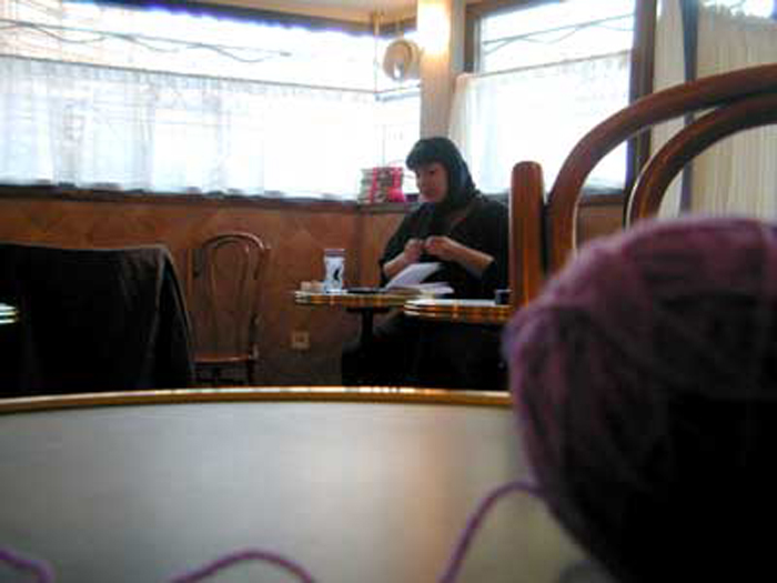 Thousands of books wrapped with color yarn are piled up all over the cafe and colorful balls are scattered on the floor. I am sitting and reading out loud from a book whose every other page is a classic of world literature — Conference of the Birds, Faust and The Little Prince, One Hundred Years of Solitude, Master and Margarita, The Advantages of Vegetarianism (by contemporary writer Sadeq Hedayat) for twelve uninterrupted hours.