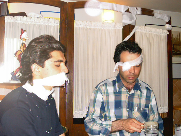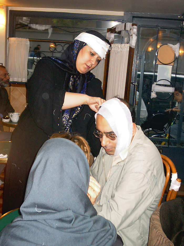 It is during the days of America’s attack on Iraq. Our old wounds have festered and we now commiserate with those who we one day considered our enemy. I start bandaging everything in the café, from the tables and chairs and tableaux and lamps to the cups and customers and their things, the railings and the tree opposite the café…. Everything. We are deeply injured, it appears.